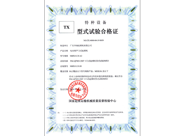 下一个:电动葫芦桥式起重机特种设备型式试验证书